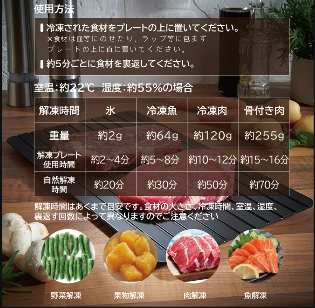 急速解凍プレートは、冷凍食品や冷凍の食材を短時間で解凍できる便利なアイテムです。食材の食感や栄養素を保ちながら、料理の時短にもなります。